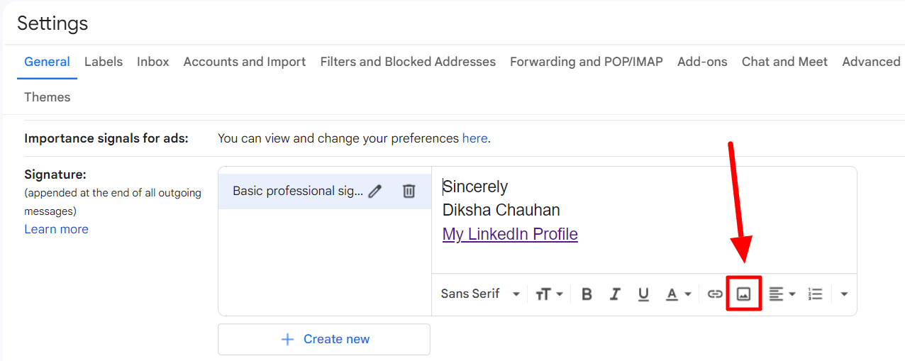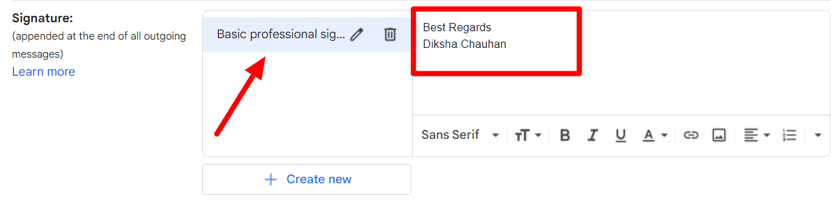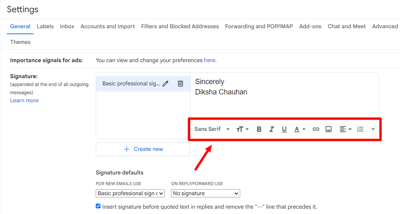 A new window will open in Settings after entering a signature name. Here, you can enter the signature that you want. You’ll see a formatting menu at the bottom of the text box. You can change the font type and size, italicize or bold your text from here. You can also insert a hyperlink in your signature or even upload an image.