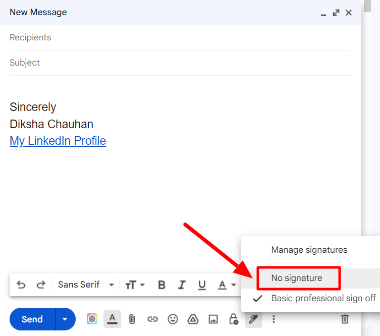 This will open a menu where you can click “No signature” to exclude a signature from just that particular email.