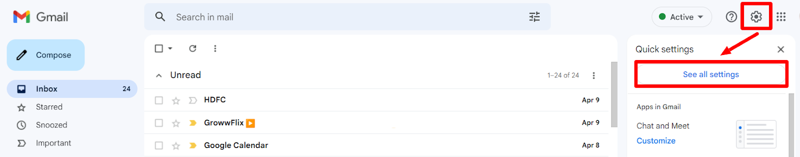 After reaching your Gmail inbox, click the gear icon on the top right corner to open the “Settings” menu. This will open the “Quick settings” menu only. So, click the “See all settings” to open the detailed settings menu.