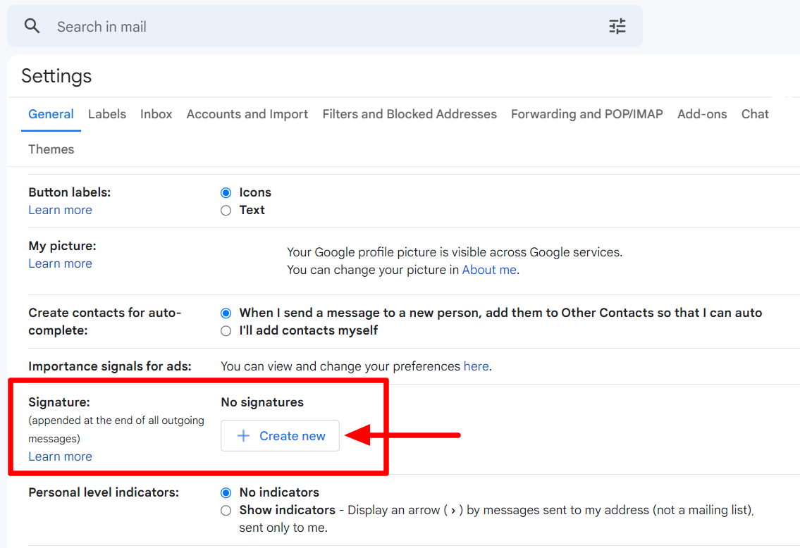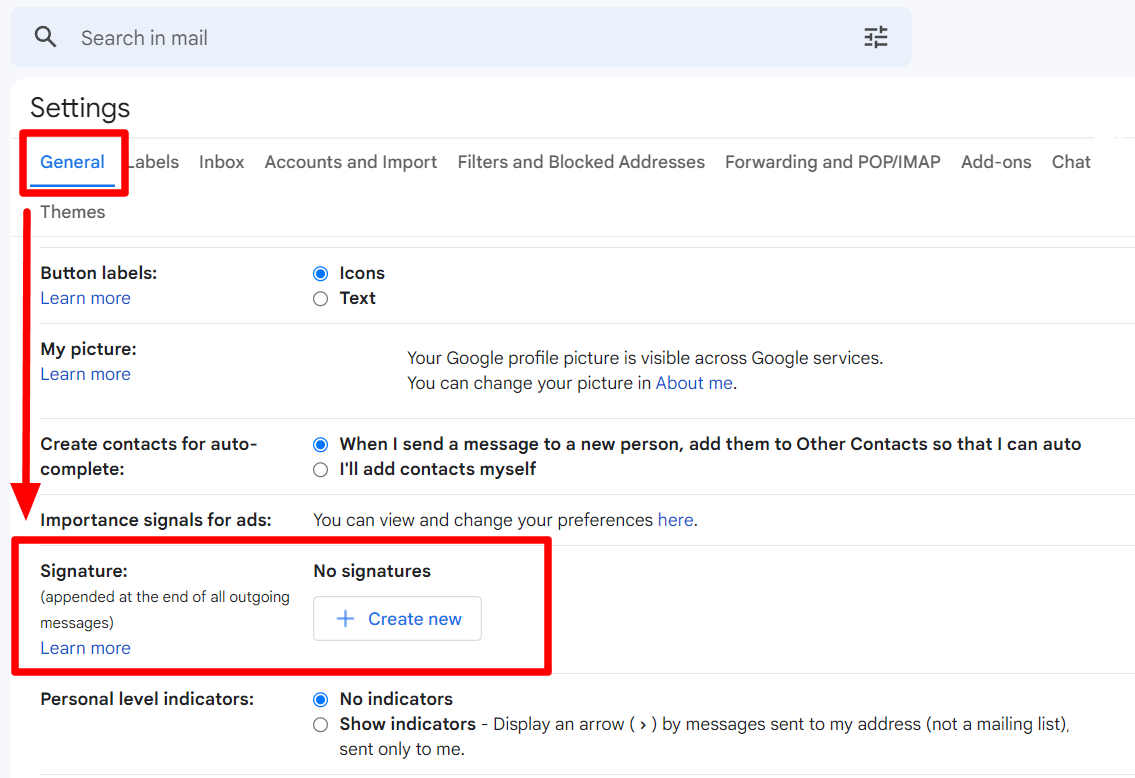 To find your current Gmail signature, look under the “General” tab. You’ll have to scroll down to find the “Signature” setting.
