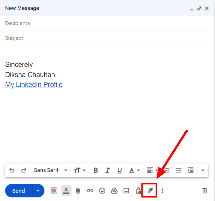 If you just want to remove signatures from one particular email, look for the “Insert Signature” button at the bottom of the new message window and click it.
