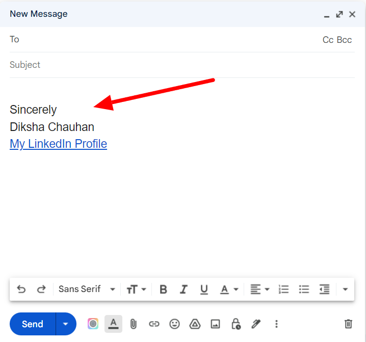 This will open a new message window, showing how your signature will be displayed at the bottom of a new email.