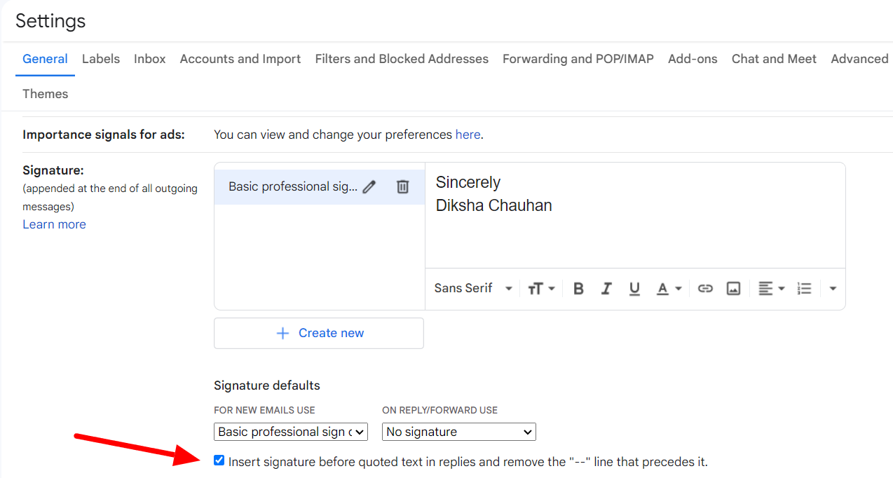 If you’d like your signature to show before the quoted text in emails and without the “--” line, you can check the box at the bottom of the signature email default settings.