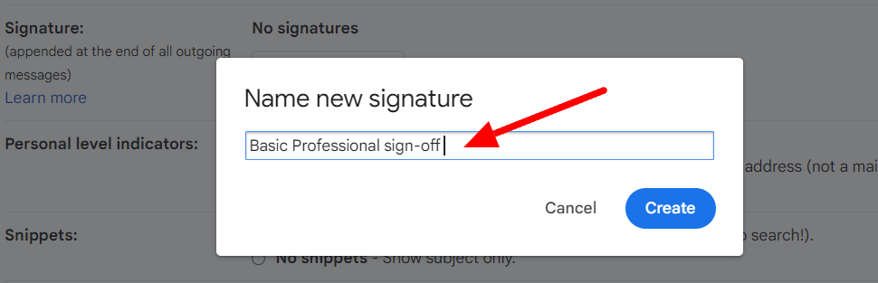 Input the name and click “Create.” Note that this is only the name for the signature and not the signature itself.