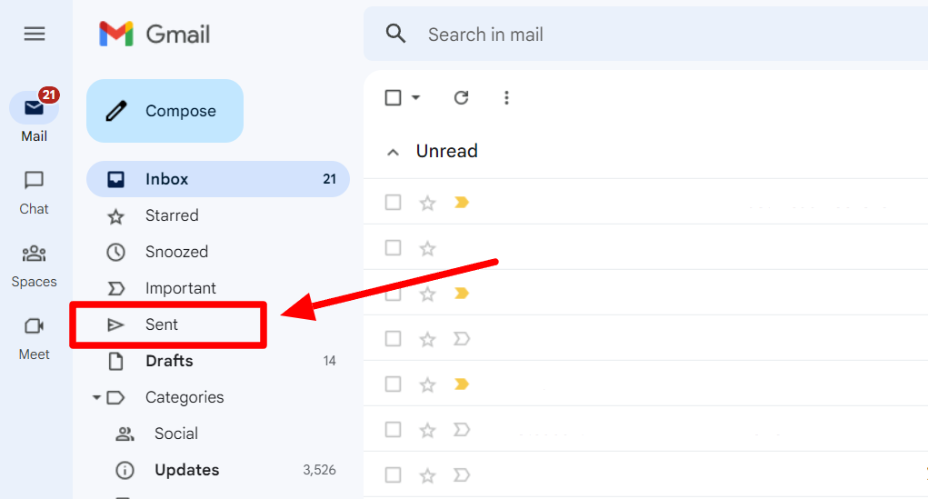 First, go to Gmail. Find and click the “Sent” email folder in your Gmail inbox on the left side panel.