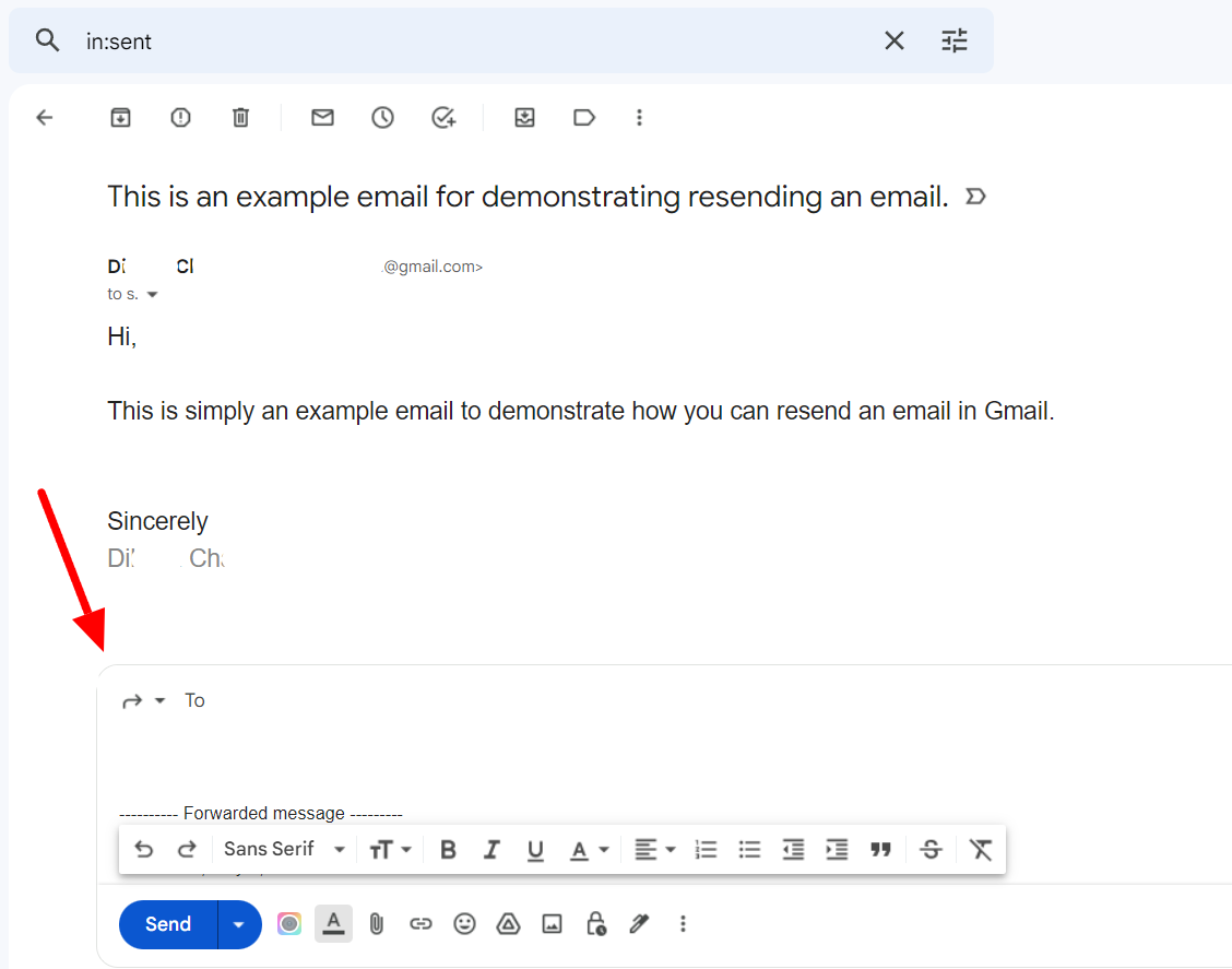 Now, in front of “To,” enter the same recipient's email address again. You may also add text below explaining why you’re resending the email.